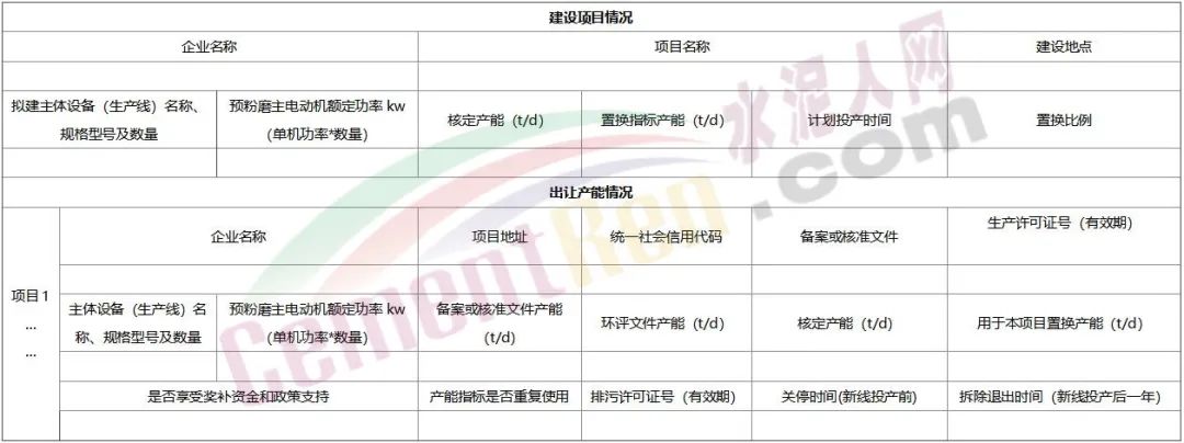 (二)用于置换的产能所属企业名称,统一社会信用代码,主体设备(生产线)所在具体位置,企业的水泥生产许可证号及有效期,主体设备(生产线)名称、规格型号及数量,备案或核准文件上的设计产能,实际产能,核定产能,用于本项目置换产能,计划关停时间,计划拆除时间。