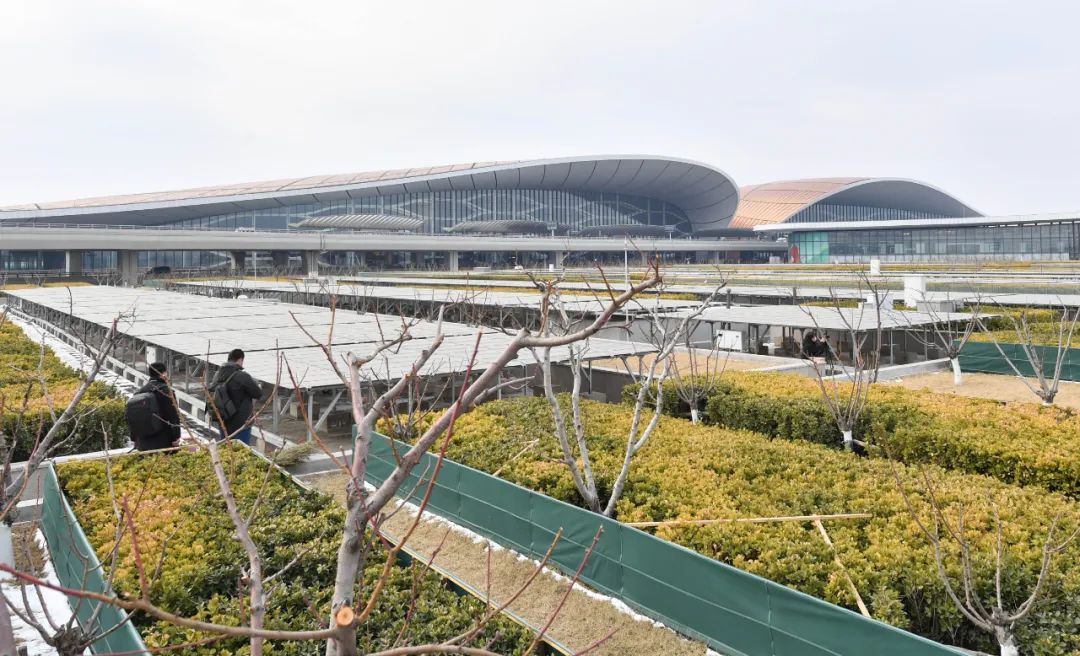 ▲2022年2月18日,大兴机场停车楼屋顶被光伏发电组件和绿植所覆盖,预计可实现每年碳减排量2500吨左右。新京报记者 李木易 摄