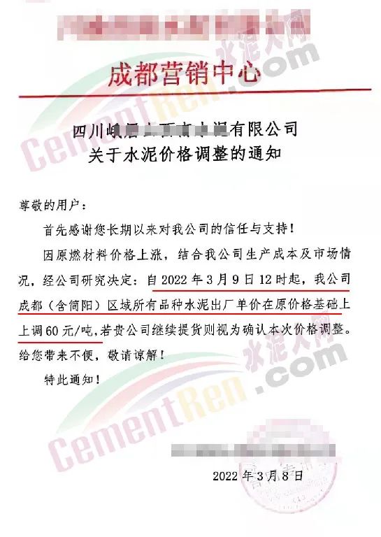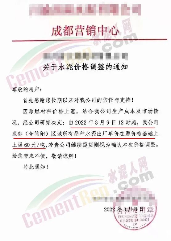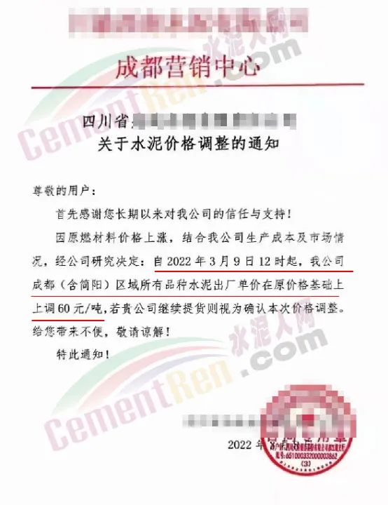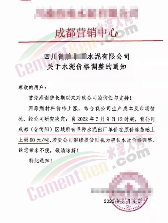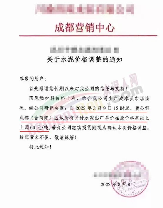 同日,四川成都区域主要品牌企业通知因原燃材料价格上涨,结合公司生产成本及市场情况,经研究决定自3月9日12时上调成都(含简阳)区域所有品种水泥出厂价60元/吨。