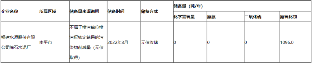 3月8日,福建省南平市生态环境局发布《南平市环境影响评价与排污权管理技术中心关于福建水泥股份有限公司炼石水泥厂排污权收储情况的公示》称,根据相关规定,现将福建水泥股份有限公司炼石水泥厂已核定的过期的可交易排污权(有效期2015年6月1日至2020年5月31日)指标予以收储。具体《公示》如下: