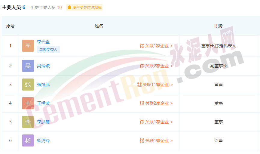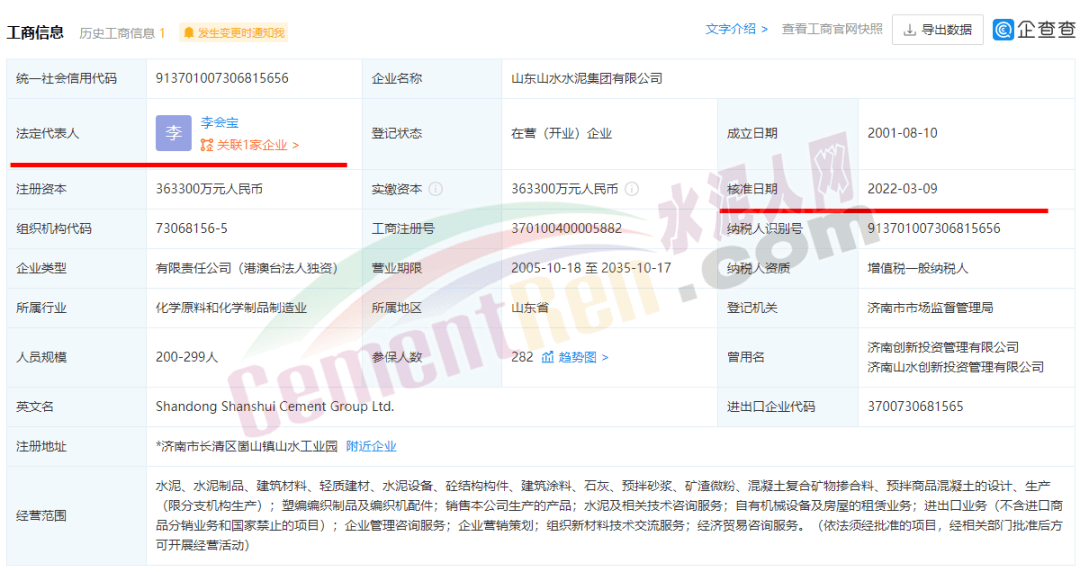 3月10日, 山东山水水泥集团有限公司(以下简称“山水水泥”)主要成员发生变更,法定代表人从常张利变更为李会宝。