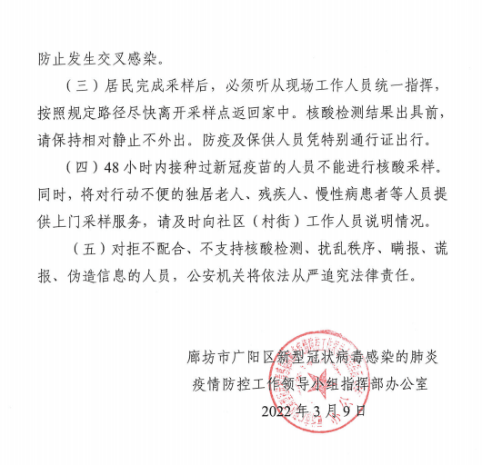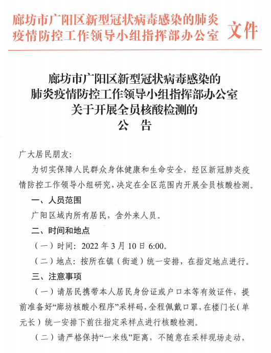 河北廊坊开发区决定在全区范围内开展全员核酸检测。