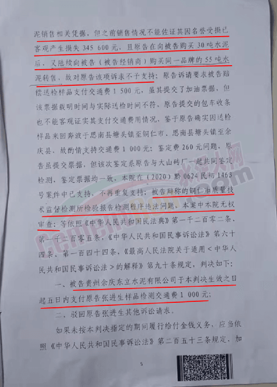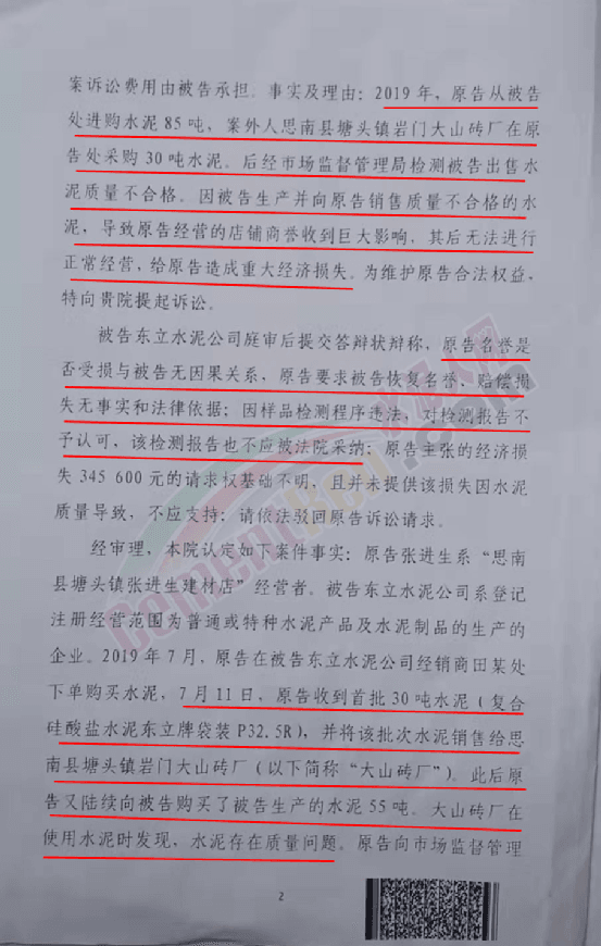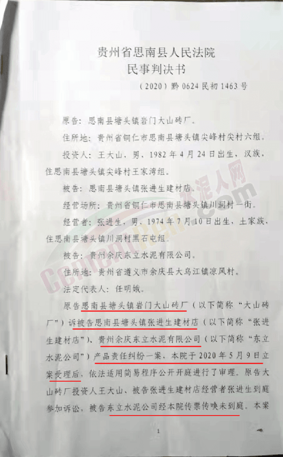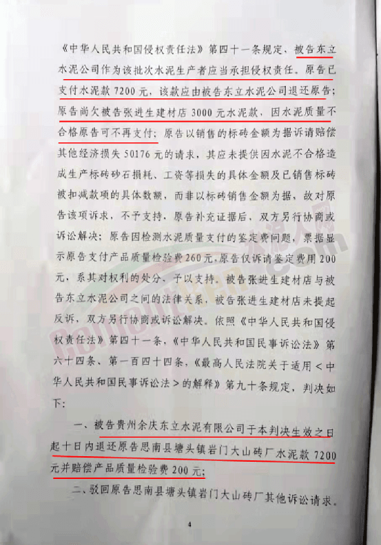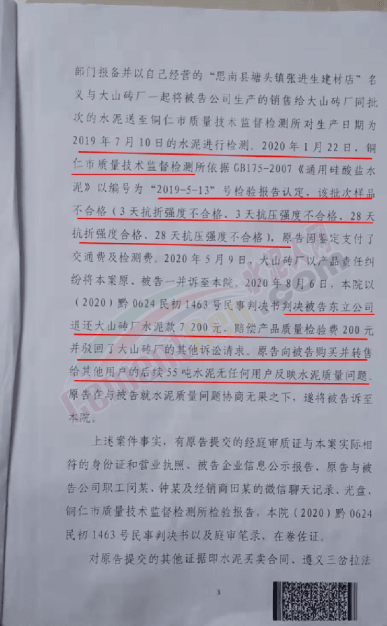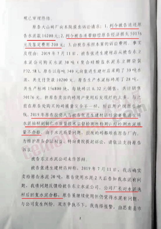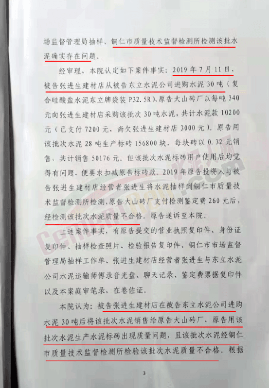 法院判决书提到,被告张进生建材店在被告东立水泥公司进购水泥30吨后将该批次水泥销售给原告大山砖厂,原告用该批次水泥生产水泥标砖出现质量问题,且该批次水泥经铜仁市质量技术监督检测所检验该批次水泥质量不合格。