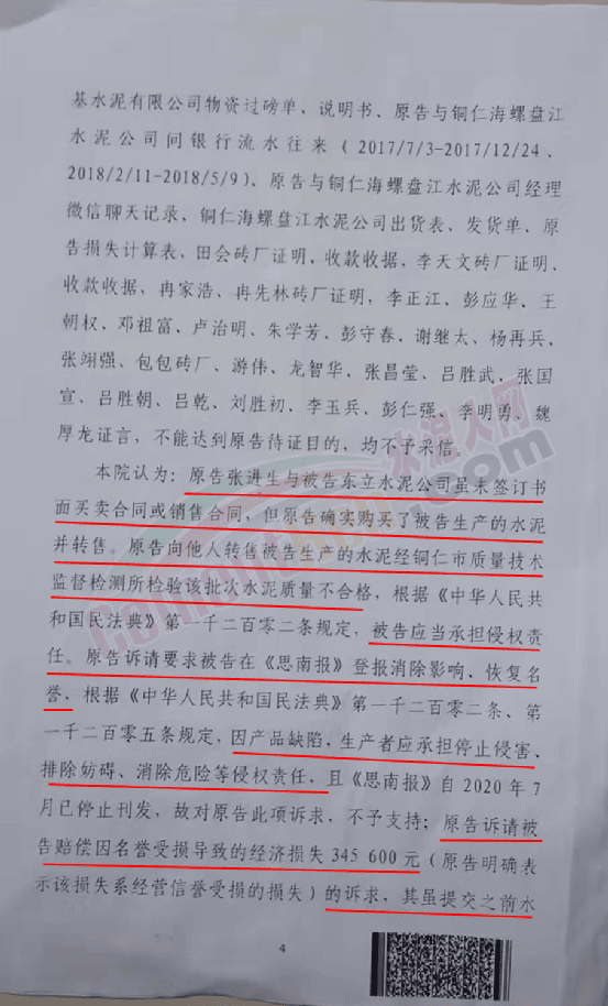 法院认为,原告张进生与被告东立水泥公司虽未签订书面买卖合同或销售合同、但原告确实购买了被告生产的水泥并转售。原告向他人转售被告生产的水泥经铜仁市质量技术监督检测所检验该批次水泥质量不合格,根据《中华人民共和国民法典》第一千二百零二条规定,被告应当承担侵权责任。原告诉请要求被告在《思南报》登报消除影响、恢复名誉、根据《中华人民共和国民法典》第一千二百零二条、第一千二百零五条规定,因产品缺陷,生产者应承担停止侵害、排除妨碍、消除危险等侵权责任且《思南报》自 2020年7 月已停止刊发,故对原告此项诉求、不予支持;