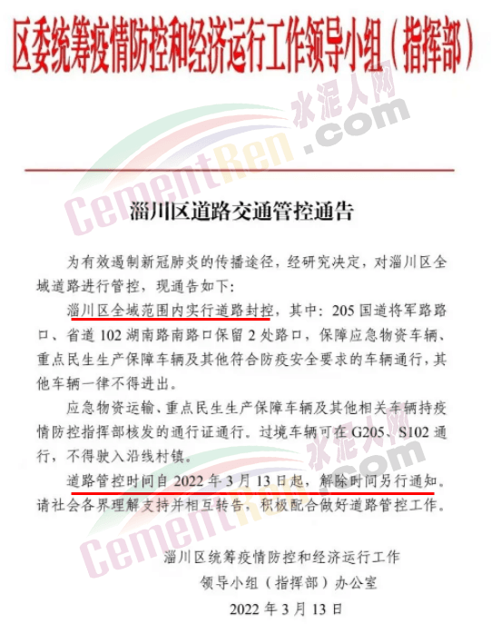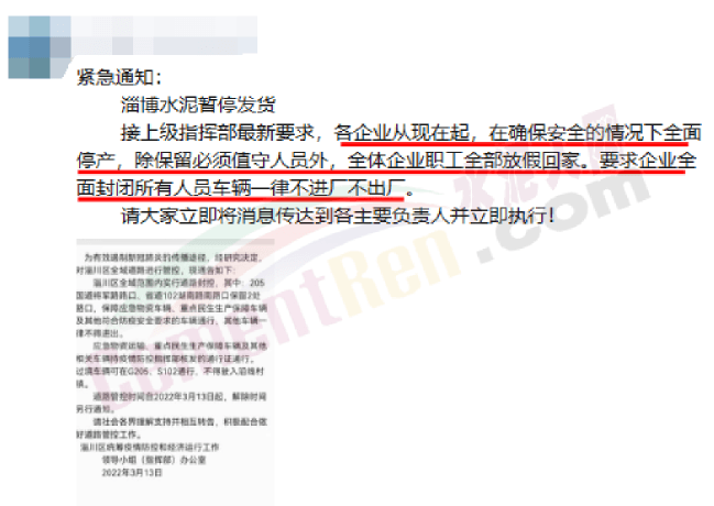 水泥人网通讯员消息,受不可抗力影响,上海部分区域水泥中转库暂停发,预计这种情况将持续2-3天。同日,山东淄博企业通知称,接上级指挥部最新要求,各企业从现在起,在确保安全的情况下全面停产,除保留必须值守人员外,全体企业职工全部放假回家,要求企业全面封闭所有人员车辆一律不进厂不出厂。
