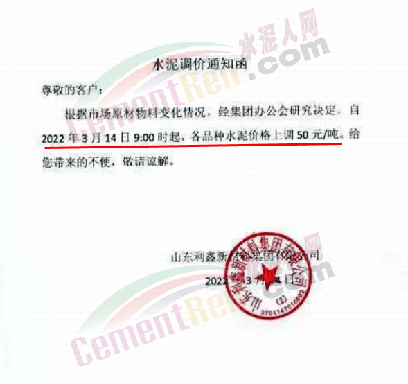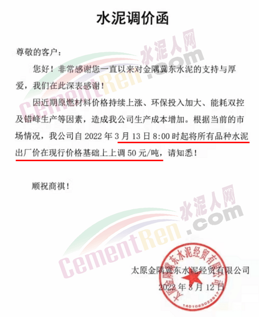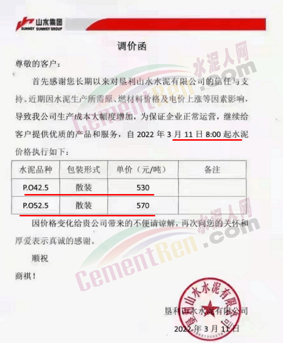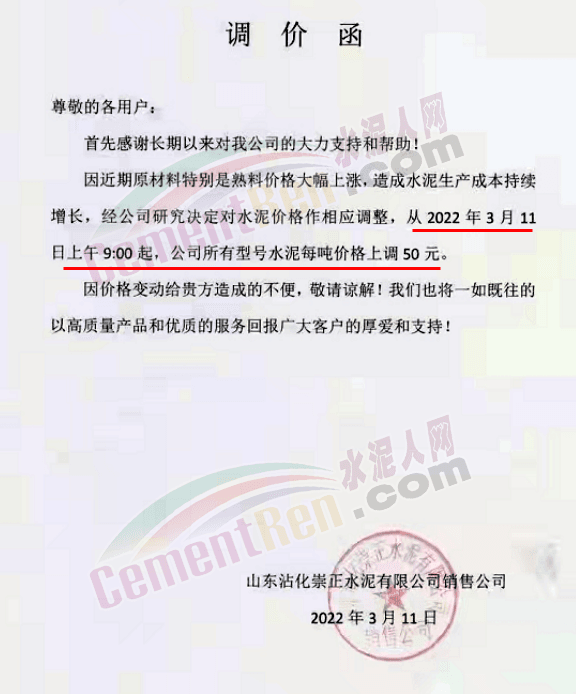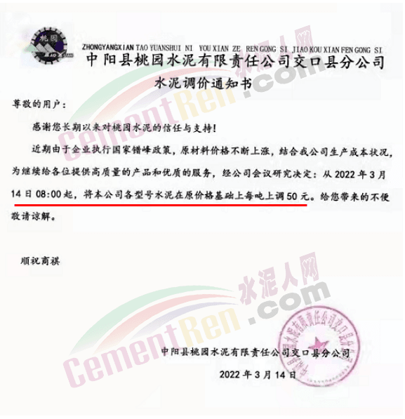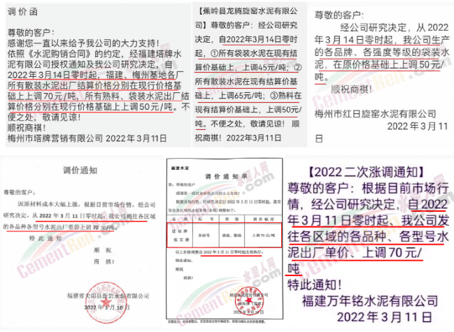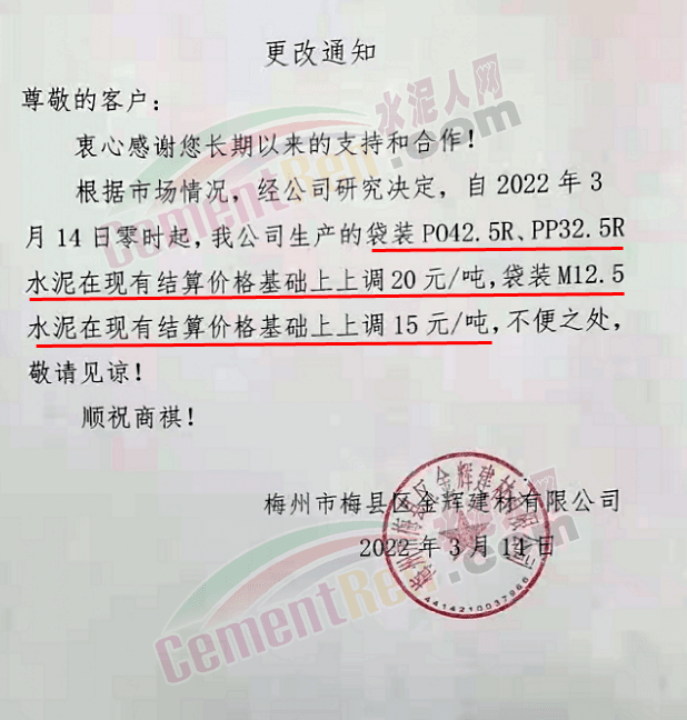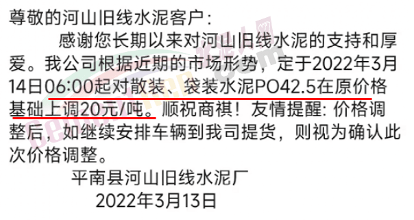 据了解,该企业3月13日时曾通知自2022年3 月14日零时起,公司生产的各品种散装水泥在现有结算价格基础上上调65元/吨,袋装PO42.5R、PP32.5R 水泥在现有结算价格基础上上调45元/吨,袋装M12.5 水泥在现有结算价格基础上上调 30元/吨。