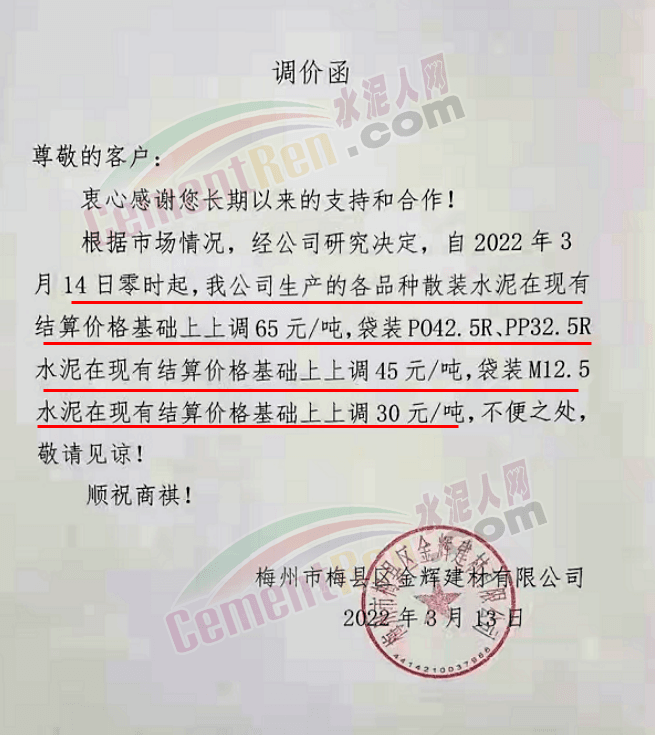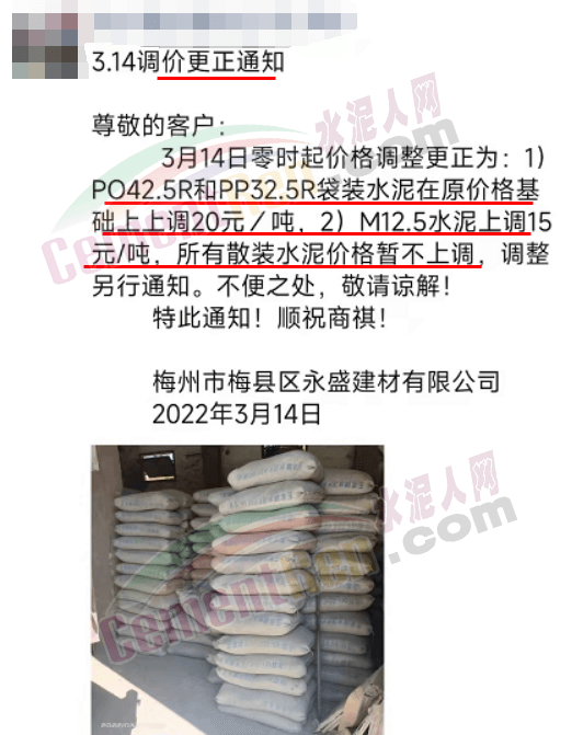 与此同时福建、广东、山东、四川等多区域市场迎来一轮价格普涨。梅州市梅县区永盛建材有限公司发调价更正通知称,3月14日零时起价格调整更正为PO42.5R和PP32.5R袋装水泥在原价格基础上上调20元/吨,M12.5水泥上调15元/吨,所有散装水泥价格暂不上调。