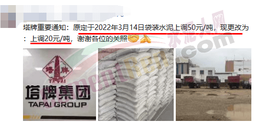 塔牌水泥通知,原定于2022年3月14日袋装水泥上调50元/吨,现更改为上调20元/吨。