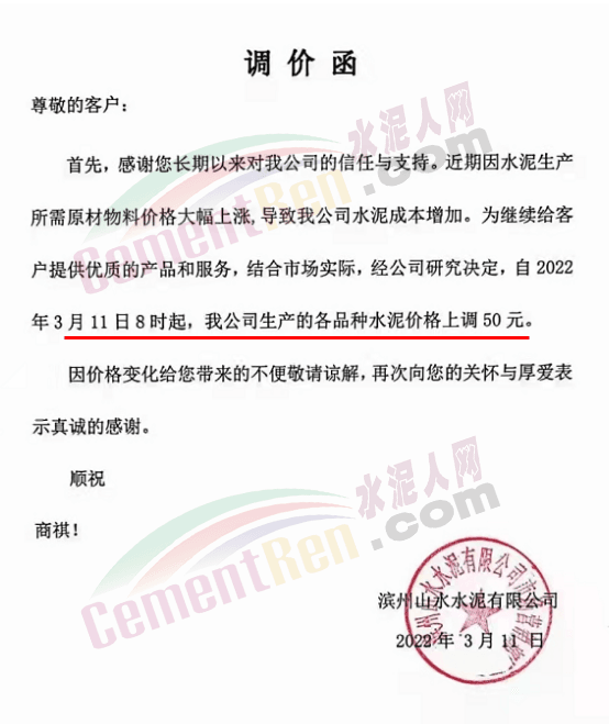 宁波区域一水泥经销商通知称,自2022年3月14日0时起,对PO42.5散装,M32.5散装水泥价格上调10元/吨。