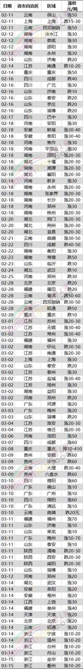 同样波动频繁的还有山东济南跌30元/吨,涨10元/吨;山东泰安跌40元/吨,涨10元/吨;山东淄博跌40元/吨,涨10元/吨;江苏南通跌10-20元/吨,涨20-30元/吨;河南郑州涨50元/吨,跌50元/吨;云南曲靖涨30-50元/吨,跌20元/吨;云南西双版纳涨50元/吨,跌30-50元/吨……