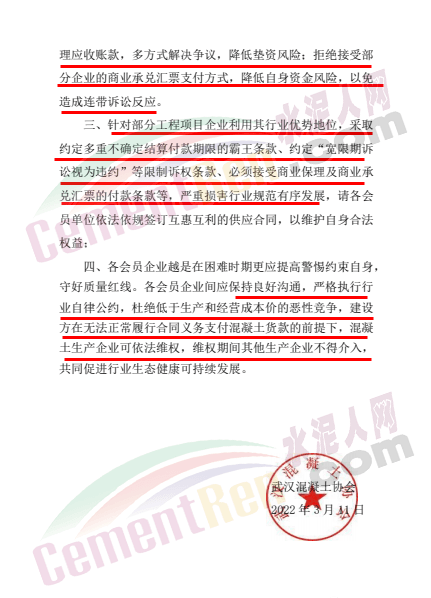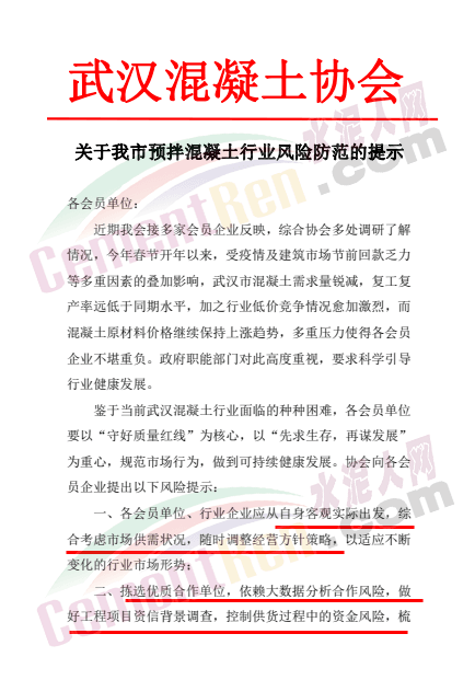 湖北武汉市混凝土协会发文给各会员单位称,今年春节开年以来,受疫情及建筑市场节前回款乏力等多重因素的叠加影响,武汉市混凝土需求量锐减,复工复产率远低于同期水平,加之行业低价竞争情况愈加激烈,而混凝土原材料价格继续保持上涨趋势,多重压力使得各会员企业不堪重负。鉴于当前武汉混凝土行业面临的种种困难,协会向各会员企业提出以下风险提示,各企业应从自身客观实际出发,综合考虑市场供需状况,随时调整经营方针策略,以适应不断变化的行业市场形势;拣选优质合作单位,依赖大数据分析合作风险,做好工程项目资信背景调查,控制供货过程中的资金风险,梳理应收账款,多方式解决争议,降低垫资风险;拒绝接受部分企业的商业承兑汇票支付方式,降低自身资金风险,以免造成连带诉讼反应。