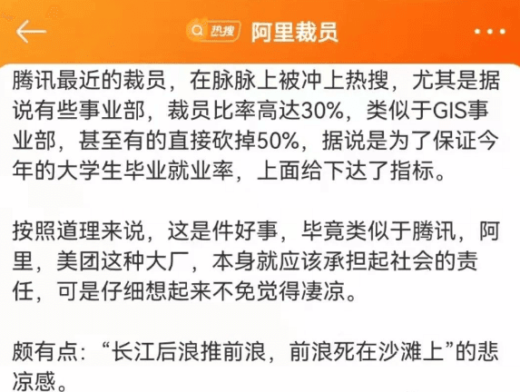 据水泥人网了解,近期阿里裁员、腾讯裁员迅速登录热门榜,腾讯预计裁员10~30%。而阿里旗下MMC事业群正计划裁员,本次裁员数量约20%……现在的就业环境更是让人后背发凉。