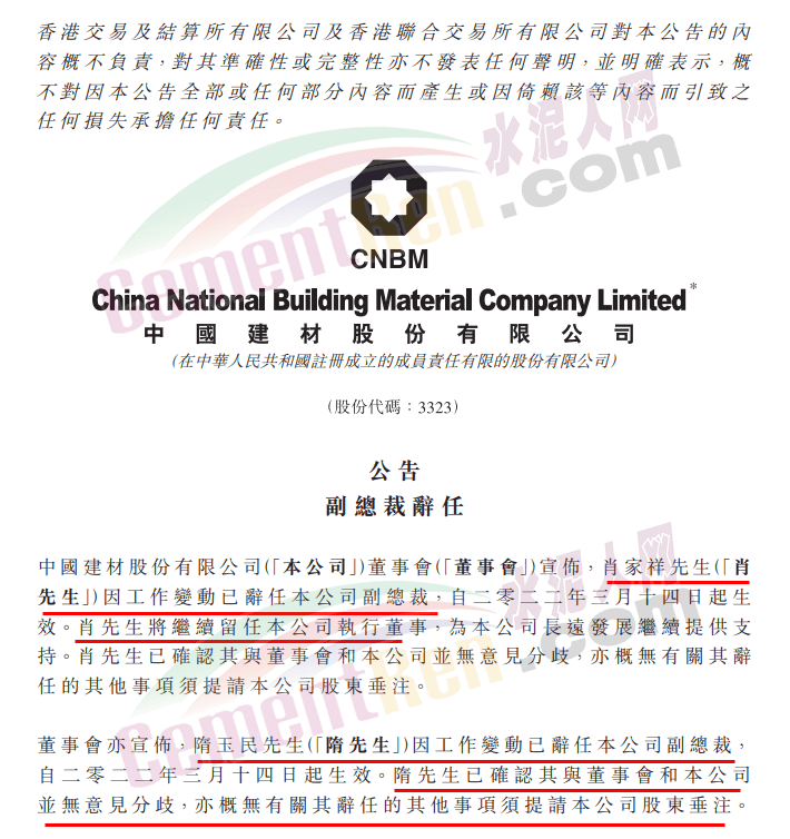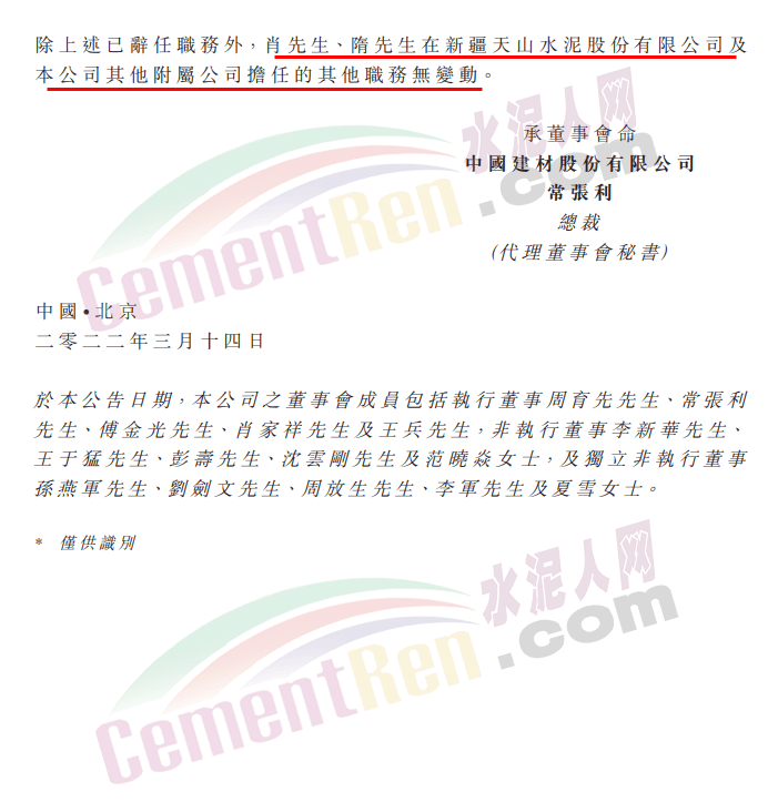 中国建材公告,肖家祥因工作变动已辞任公司副总裁,自2022年3月14日起生效。肖将继续留任公司执行董事,为公司长远发展继续提供支持。董事会亦宣布,隋玉民因工作变动已辞任公司副总裁,自2022年3月14日起生效。