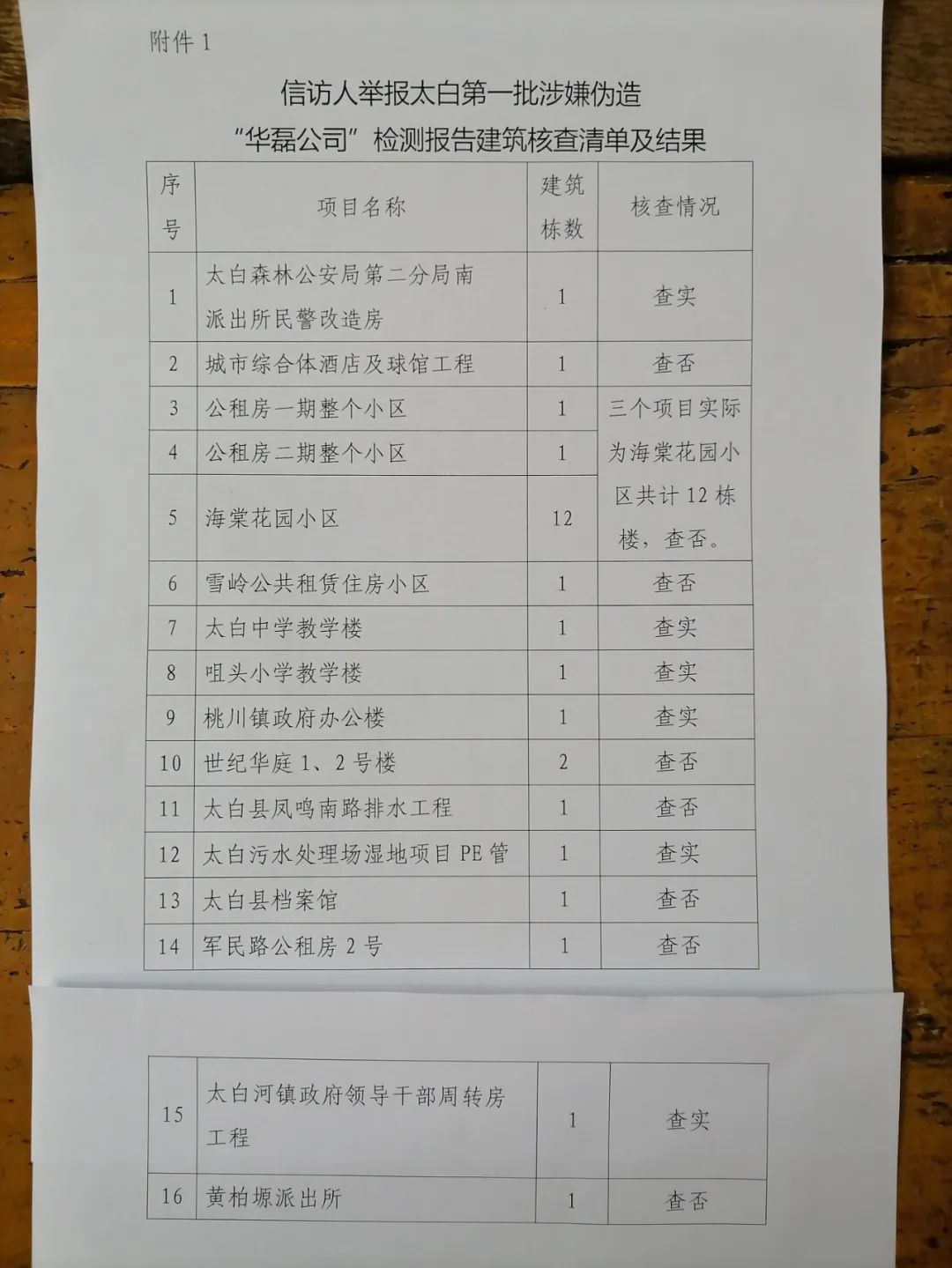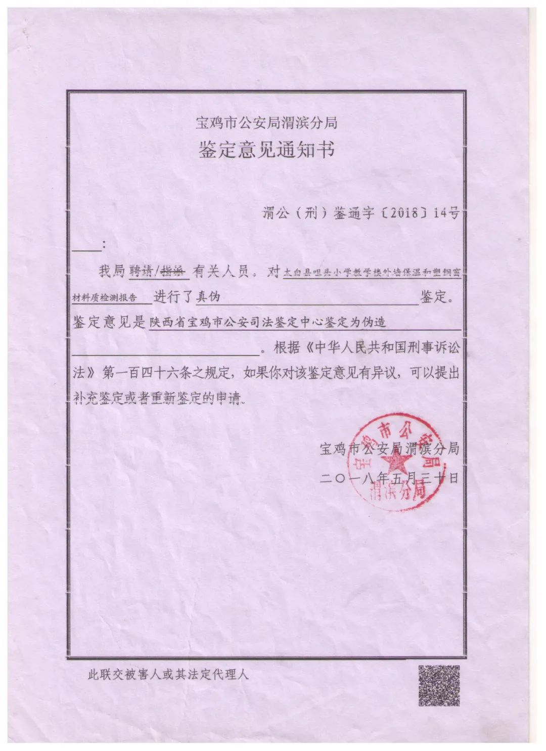 △公安机关鉴定证实,太白县中学教学楼相关检测报告系伪造