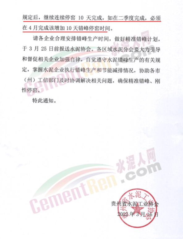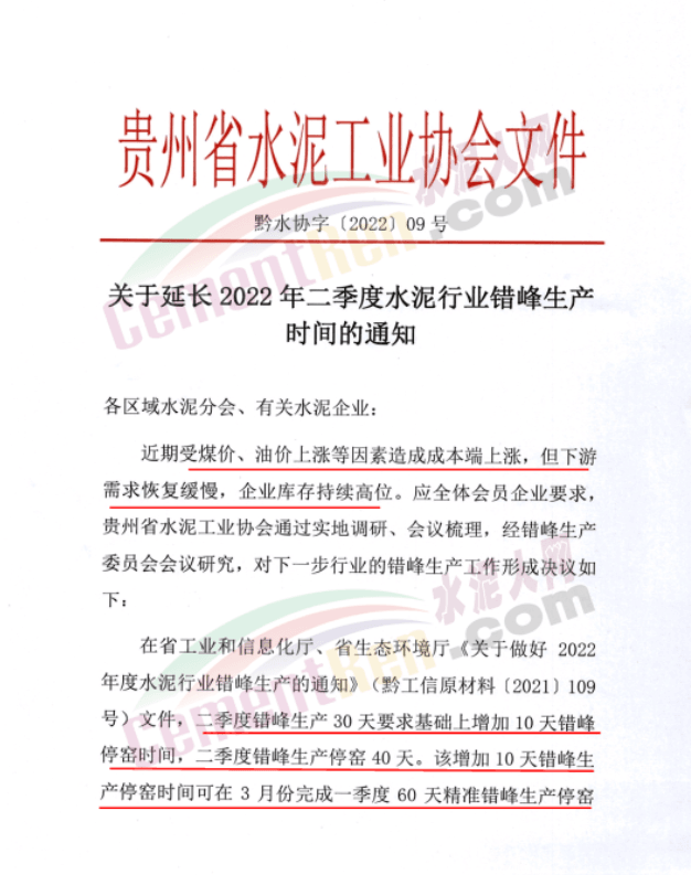 3月16日,贵州省水泥工业协会发布了《关于延长2022年二季度水泥行业错峰生产时间的通知》称,近期受煤价、油价上涨等因素造成成本端上涨,但下游需求恢复缓慢,企业库存持续高位。应企业要求延长2022年错峰生产时间,其中二季度错峰生产30天要求基础上增加10天错峰停窑时间,二季度错峰生产停窑 40天。