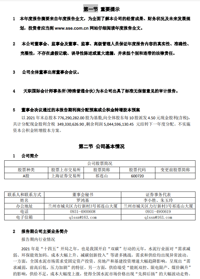 祁连山水泥3月17日晚间发布年度业绩报告同时连发多份公告。年度报告中提到,2021年营业收入约76.73亿元,同比减少1.78%;归属于上市公司股东的净利润盈利约9.48亿元,同比减少34.07%;基本每股收益盈利1.2206元,同比减少34.06%。