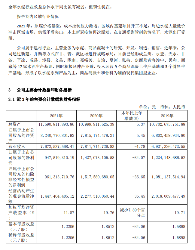 公司属于建材行业,主营业务为水泥、商品混凝土的研究、开发、制造、销售。近年来,公司通过新建、并购等方式在甘、青、藏区域进行战略布局,目前已经形成兰州、永登、天水、甘谷、平凉、成县、漳县、文县、陇南、嘉峪关、古浪、夏河、张掖、定西及青海湟中、民和、西藏等17家水泥生产基地,同时积极延伸产业链,投入运营9个商品混凝土生产基地和3个骨料生产基地,形成了以水泥系列产品为主,商品混凝土和骨料为辅的现代集团型企业。