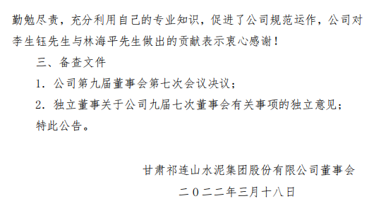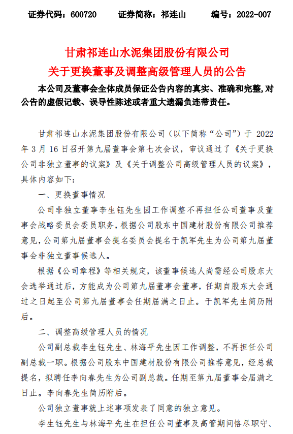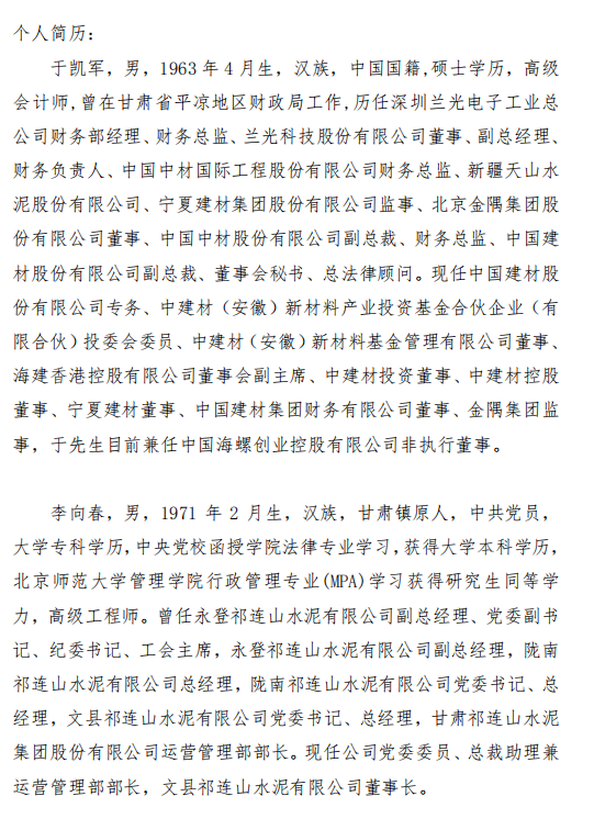同时发布的《关于更换董事及调整高级管理人员的公告》称,公司非独立董事李生钰先生因工作调整不再担任公司董事及董事会战略委员会委员职务,根据公司股东中国建材股份有限公司推荐意见,公司第九届董事会提名委员会提名于凯军先生为公司第九届董事会非独立董事候选人。公司副总裁李生钰先生、林海平先生因工作调整,不再担任公司副总裁一职。根据公司股东中国建材股份有限公司推荐意见,经总裁提名,拟聘任李向春先生为公司副总裁。