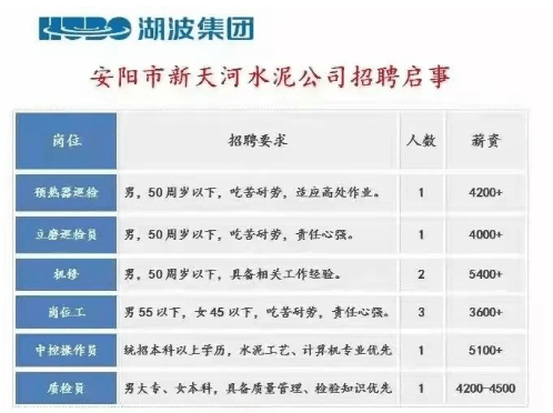 河南湖波集团安阳市新天河水泥招聘预热器巡检、立磨巡检、机修工、岗位工、中控员、质检员等,薪资在4000-5400元/月。