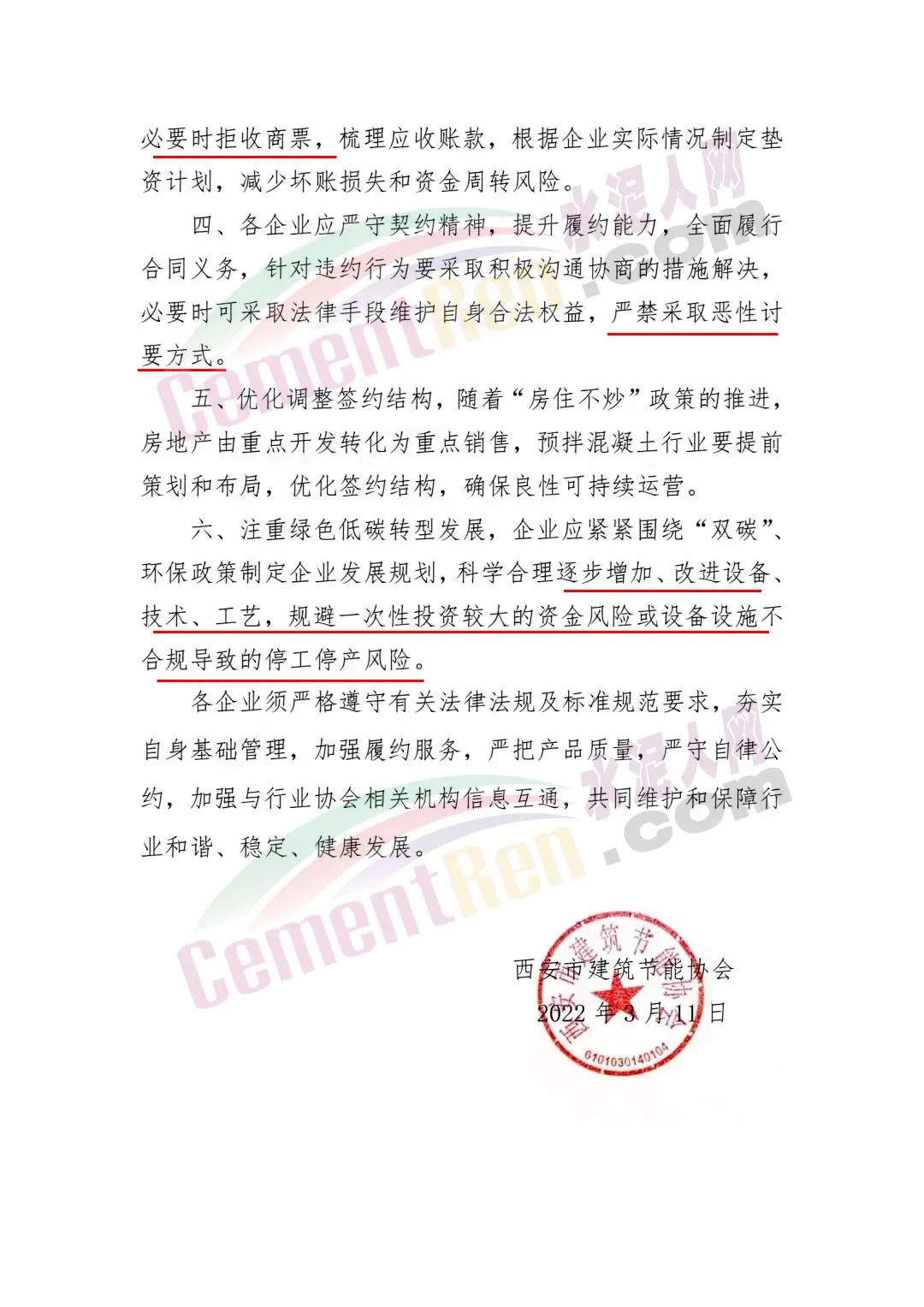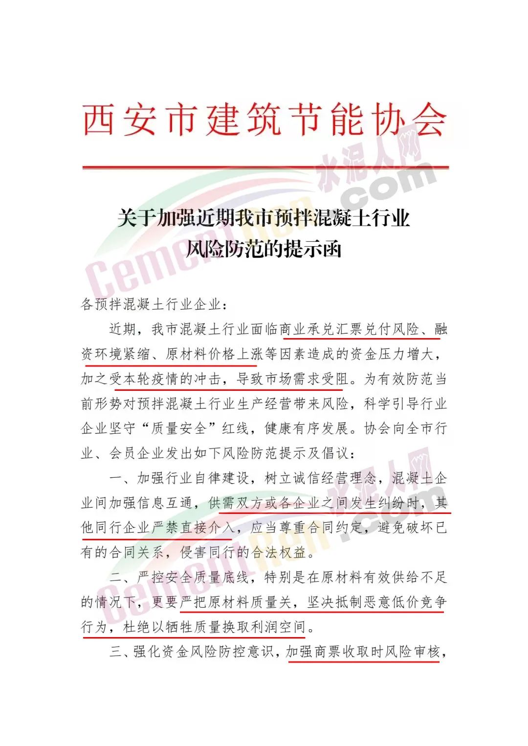 日前,西安市建筑节能协会发文称,近期,西安市混凝土行业面临商业承兑汇票兑付风险、融资环境紧缩、原材料价格上涨等因素造成的资金压力增大,加之受本轮疫情的冲击,导致市场需求受阻。协会特发布风险防范提示及倡议: