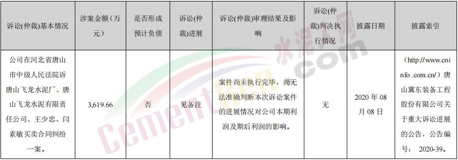 3月17日,冀东装备发布2021年年度报告,披露了一则重大诉讼、仲裁事项,该事项涉及与唐山飞龙水泥厂的合同纠纷,具体如下: