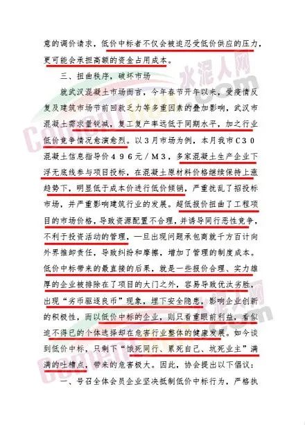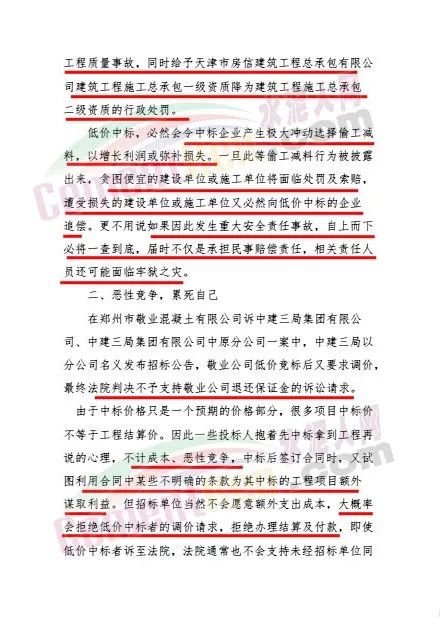 日前,武汉混凝土协会发布《混凝土行业低价中标危害及倡议》给会员单位称,混凝土行业本就竟争激烈,在交易机会稀缺的当下,为了在激烈的招投标竞争中脱颖而出,获得中标资格,不少混凝土企业选择了压低中标价格,低价抢标。而过往的惨痛教训告诉我们,低价抢标这一短视行为,不仅将造成诸多法律风险及隐患,更将对这个行业造成难以挽回的损失。