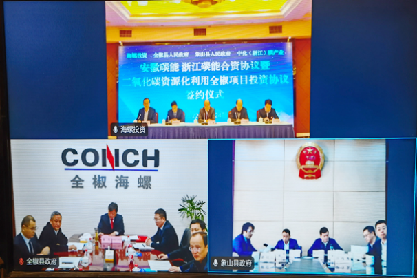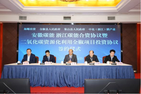 2022年3月24日上午,海螺投资公司与全椒县政府、象山县政府、中化膜产业公司通过云签约形式,正式签署安徽碳能、浙江碳能合资协议以及二氧化碳资源化利用全椒项目投资协议。全椒县、象山县主要领导及相关部门负责同志,中化膜产业公司总经理周海明,海螺集团党委委员、总经济师、海螺投资总经理丁锋,海螺投资总经理助理程竹松、海螺集团战略企划部副部长卢叔敏等出席仪式并见证签约。
