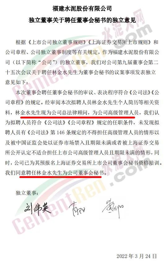 3月24日,福建水泥发布公告,经董事会提名委员会审核,董事会同意聘任林金水先生为公司董事会秘书。福建水泥已为林金水先生预报名上证所上市公司董秘资格培训,其本人将根据上证所安排参加培训。 林金水先生,1966年生,大学本科学历,高级经济师。现任福建水泥总法律顾问兼任法律顾问室经理。历任福建水泥企管部业务主任、建福水泥厂劳动服务公司经理、建福水泥厂社区中心经理,福建水泥企管部经理,福建水泥内审部经理。 具体公告如下: