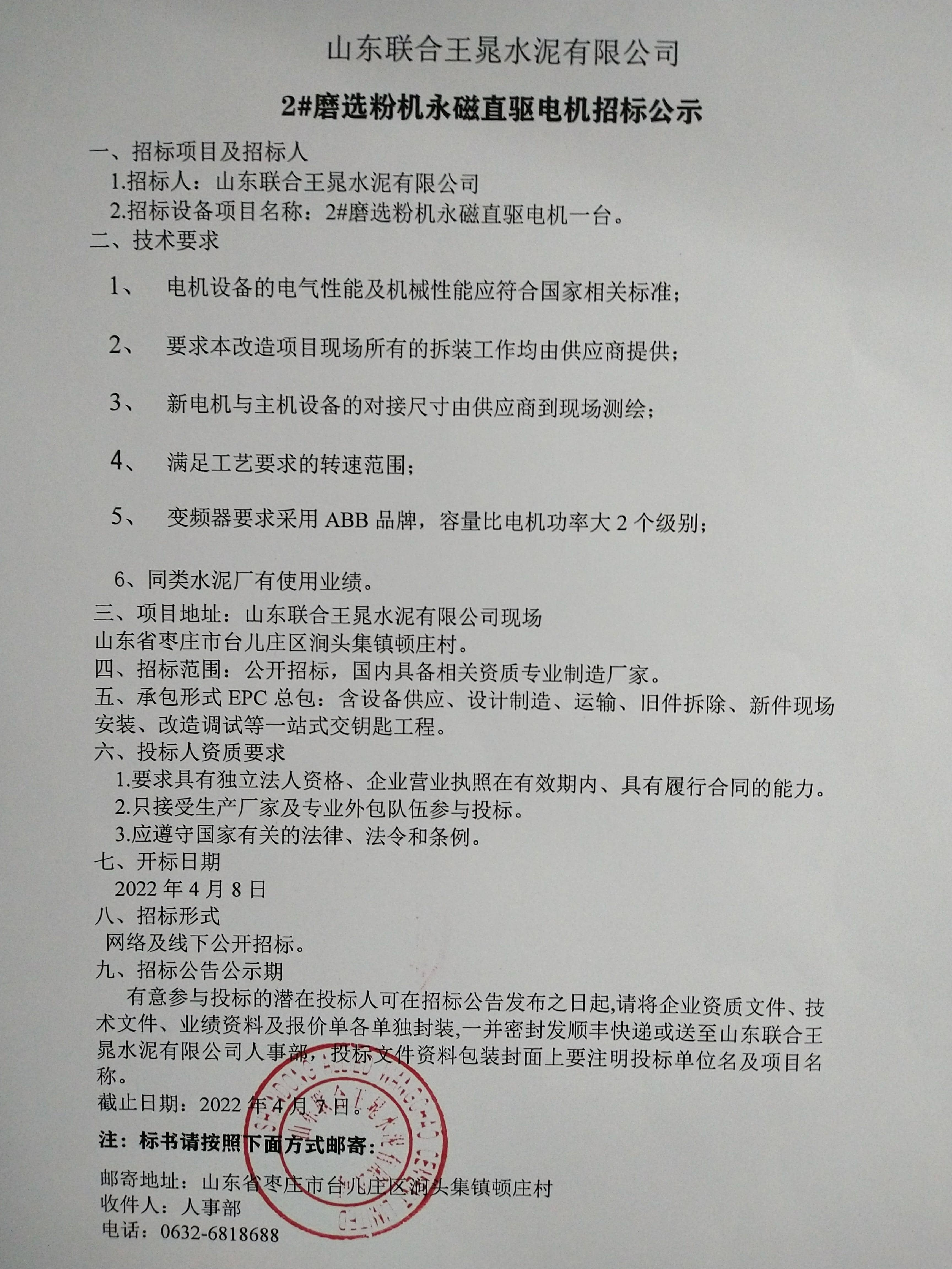 近日,山东联合王晁水泥有限公司发布了一则招标公告,招标设备为2#磨选粉机永磁直驱电机一台,招标技术要求电机设备的电气性能及机械性能应符合国家相关标准;要求本改造项目现场所有的拆装工作均由供应商提供等,