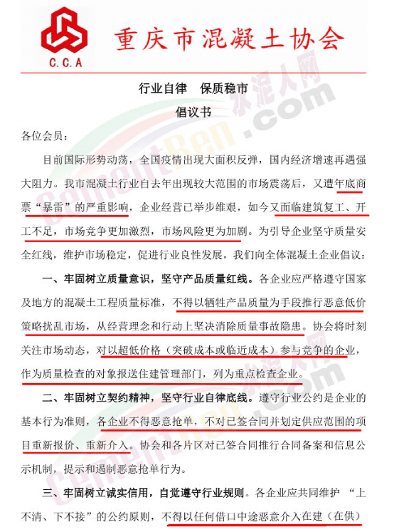 重庆市混凝土协会发布行业自律、保质稳市倡议书称,目前国际形势动荡,全国疫情出现大面积反弹,国内经济增速再遇强大阻力。重庆市混凝土行业自去年出现较大范围的市场震荡后,又遭年底商票“爆雷”的严重影响,企业经营已举步维艰,如今又面临建筑复工、开工不足,市场竞争更加激烈,市场风险更为加剧。