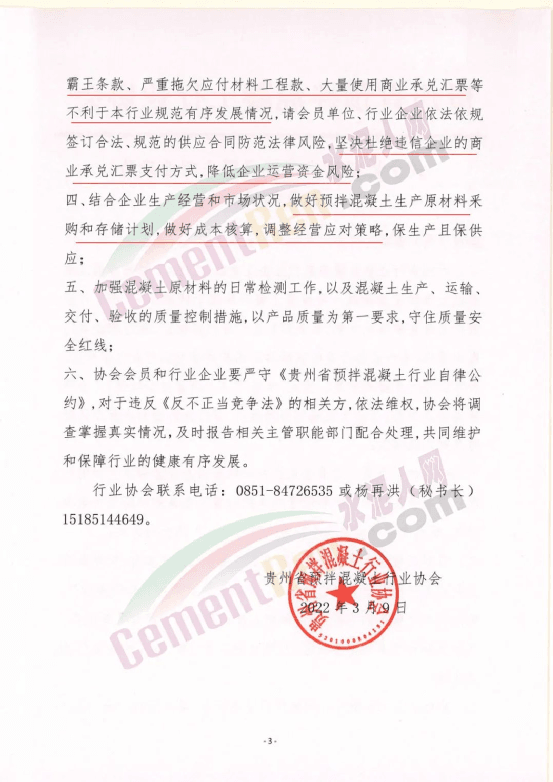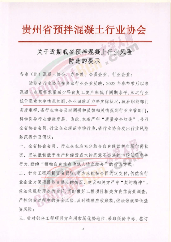 贵州省预拌混凝土行业协会文件提到,接到多家行业企业反映,2022年春节节后以来混凝土市场需求量减少导致复工复产率低于同期水平,加之行业低价恶意竞争情况加剧,企业回款乏力等实际状况。协会倡议会员企业坚决抵制低于生产和经营成本的恶意不合法的市场低价竞争行为,断绝“牺牲自身性命为他人输血续命”的行为方式;