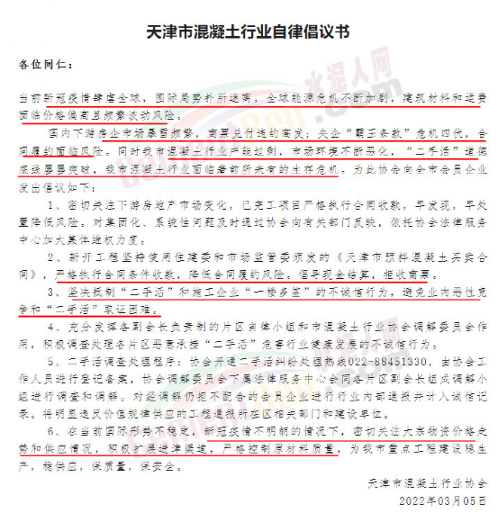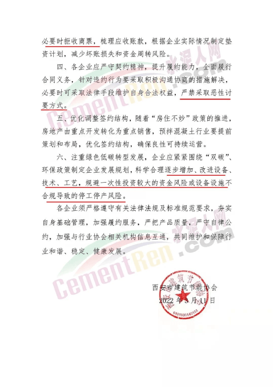 西安市建筑节能协会发通知给预拌混凝土行业企业称,近期西安市混凝土行业面临商业承兑汇票兑付风险、融资环境紧缩、原材料价格上涨等因素造成的资金压力增大,加之受本轮疫情的冲击,导致市场需求受阻。协会要求混凝土企业间加强信息互通,供需双方或各企业之间发生纠纷时,其他同行企业严禁直接介入,应当尊重合同约定,避免破坏已有的合同关系,侵害同行的合法权益;在原材料有效供给不足的情况下,更要严把原材料质量关,坚决抵制恶意低价竞争行为,杜绝以牺牲质量换取利润空间。