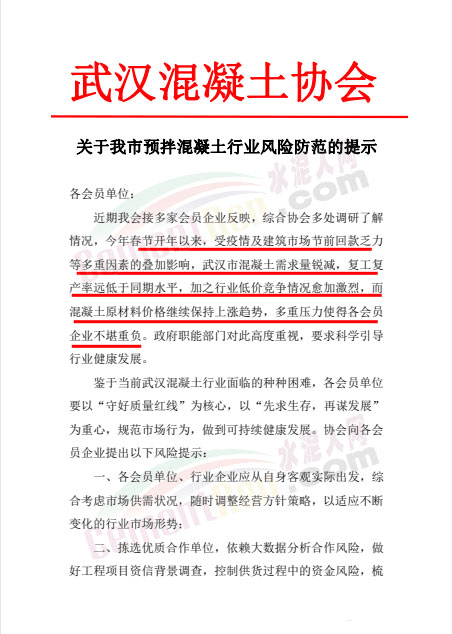 武汉混凝土协会发布风险防范提示称,接多家会员企业反映,综合协会多处调研了解情况,今年春节开年以来,受疫情及建筑市场节前回款乏力等多重因素的叠加影响,武汉市混凝土需求量锐减,复工复产率远低于同期水平,加之行业低价竞争情况愈加激烈,而混凝土原材料价格继续保持上涨趋势,多重压力使得各会员企业不堪重负。