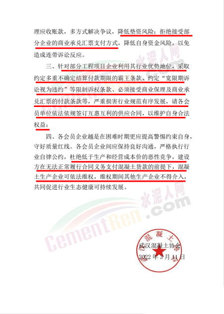 据水泥人网了解,此前武汉市混凝土协会、贵州省预拌混凝土协会、西安市建筑节能协会等多个机构都曾发布类似的风险提示和倡议文件。也多有提到基建施工开工率不足,市场竞争激烈,拒收风险商票等内容。
