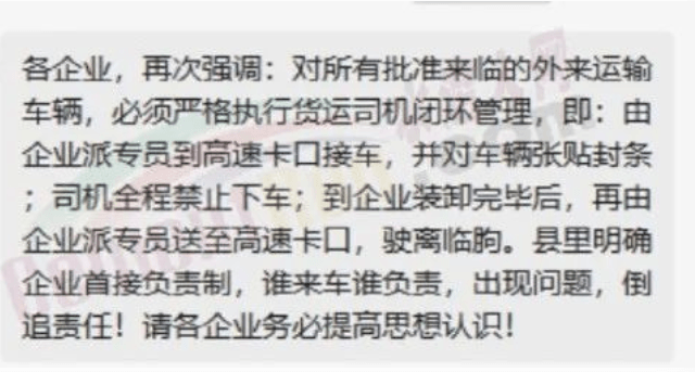 临朐企业收到通知强调,对所有批准来临的外来运输车辆,必须严格执行货运司机闭环管理,即:由企业派专员到高速卡口接车,并对车辆张贴封条;司机全程禁止下车;到企业装卸完毕后,再由企业派专员送至高速卡口,驶离临朐。县里明确企业首接负责制,谁来车谁负责,出现问题,倒追责任!