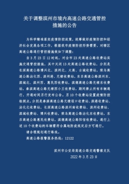 滨州市公安局高速交警支队通知,自3月23日12时起,对全市23处高速公路收费站实施交通管控措施,其中关闭13 处高速公路收费站,开通时间另行发布公告。另10个收费站设置疫情防控检测点,车辆需符合属地防疫规定后方可通行。