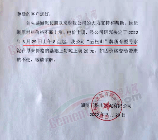 与此同时,山东淄博部分区域水泥企业通知上调水泥价格。其中,淄博五松山水泥有限公司通知因近期原材料价格不断上涨、电价上调,经公司研究决定于3月29日上午8时起上调水泥价格20元/吨。