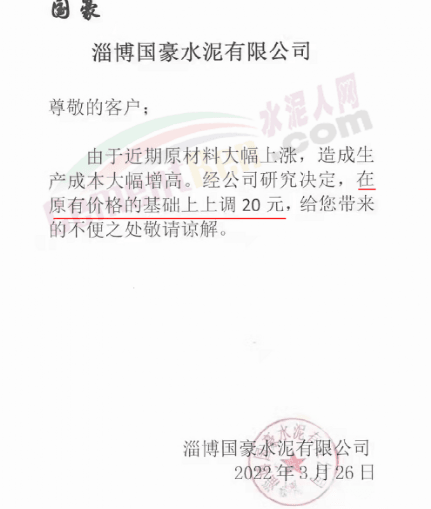 淄博国豪水泥有限公司通知,由于近期原材料大幅上涨,造成生产成本大幅增高,经公司研究决定,在原有价格基础上上调20元/吨。