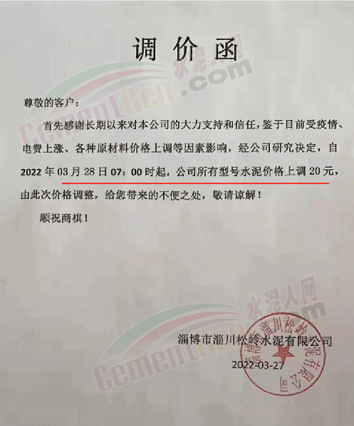 淄博市淄川松岭水泥有限公司通知,鉴于目前受疫情、电费上涨,各种原材料价格上调等因素影响,经公司研究决定,自3月28日7时起,公司所有型号水泥价格上调20元/吨。