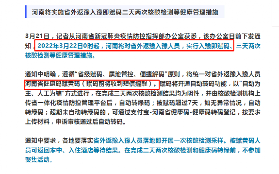 据了解,河南省新冠肺炎疫情防控指挥部办公室近期曾下发通知,自3月22日0时起对省外返豫入豫人员,实行入豫即赋黄码,三天两检等健康管理措施。