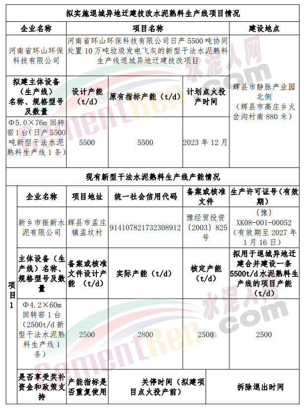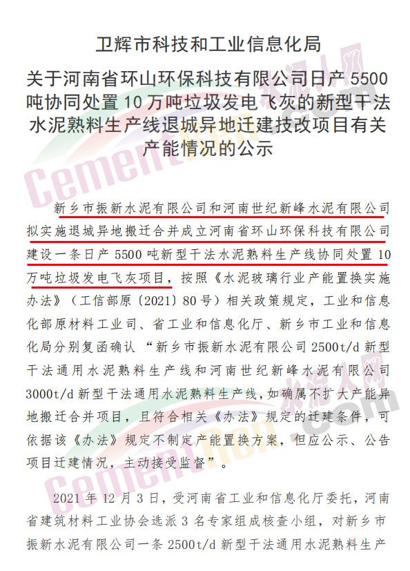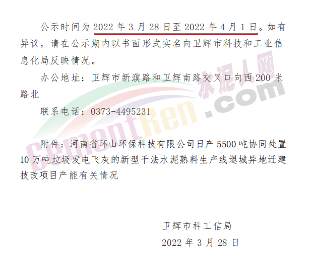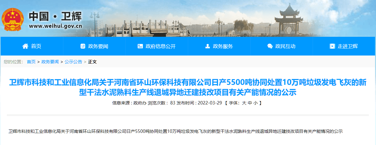 日前,河南卫辉政府办转发卫辉市科技和工业信息化局《关于河南省环山环保科技有限公司日产5500吨协同处置10万吨垃圾发电飞灰的新型干法水泥熟料生产线退城异地迁建技改项目有关产能情况的公示 》