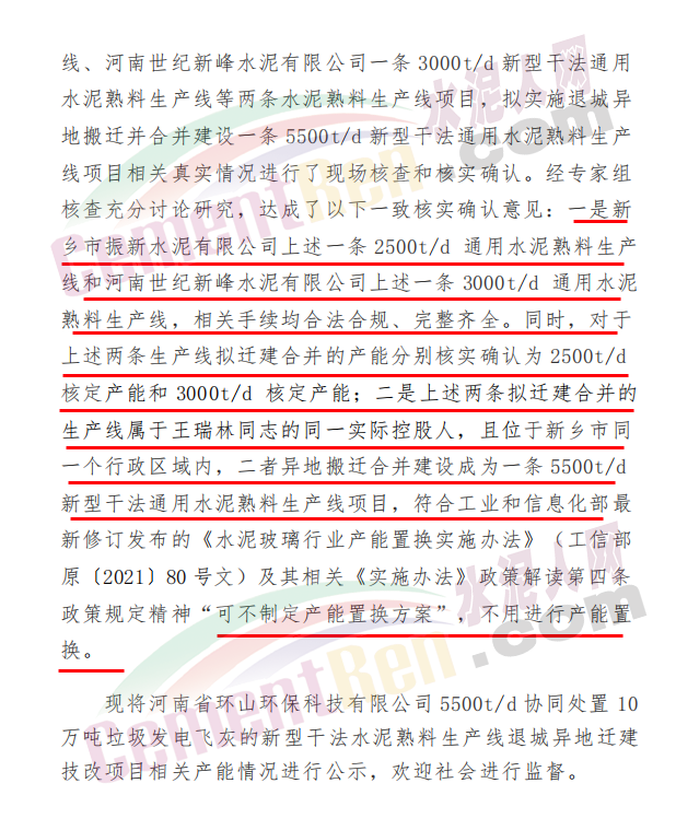 公示文件称,新乡市振新水泥有限公司和河南世纪新峰水泥有限公司拟实施退城异地搬迁合并成立河南省环山环保科技有限公司建设一条日产5500吨新型干法水泥熟料生产线协同处置10万吨垃圾发电飞灰项目,按照《水泥玻璃行业产能置换实施办法》(工信部原〔2021〕80号)相关政策规定,工业和信息化部原材料工业司、省工业和信息化厅、新乡市工业和信息化局分别复函确认 “新乡市振新水泥有限公司2500t/d新型干法通用水泥熟料生产线和河南世纪新峰水泥有限公司3000t/d新型干法通用水泥熟料生产线,如确属不扩大产能异地搬迁合并项目,且符合相关《办法》规定的迁建条件,可依据该《办法》规定不制定产能置换方案,但应公示、公告项目迁建情况,主动接受监督”。