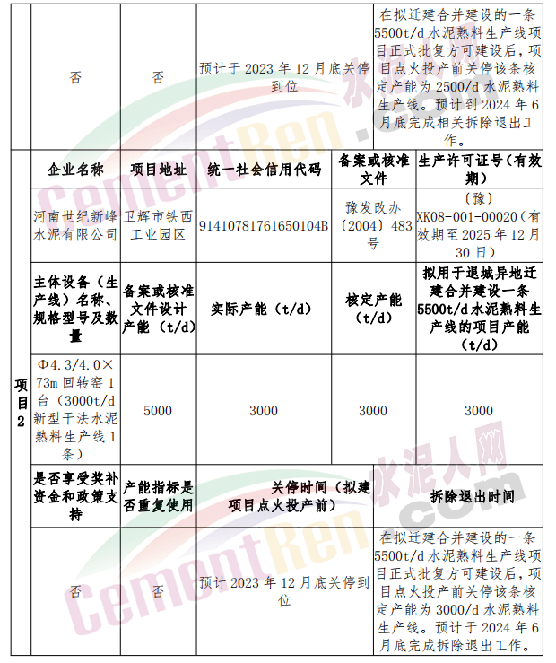 一是新乡市振新水泥有限公司上述一条2500t/d 通用水泥熟料生产线和河南世纪新峰水泥有限公司上述一条3000t/d 通用水泥熟料生产线,相关手续均合法合规、完整齐全。同时,对于上述两条生产线拟迁建合并的产能分别核实确认为2500t/d 核定产能和3000t/d 核定产能;