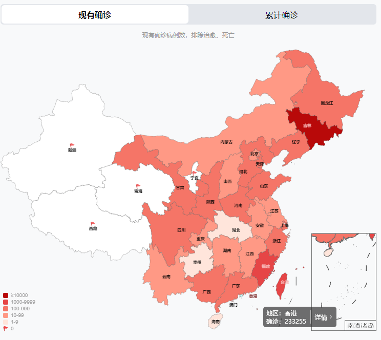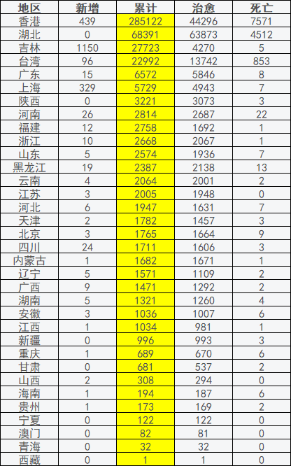 截至目前,香港累计确诊285122例,湖北累计确诊68391例,吉林累计确诊27723例,台湾累计确诊22992例,以上城市累计确诊均超过万例。广东累计确诊6572例,上海累计确诊5729例,陕西累计确诊3221例,河南累计确诊2814例,另有多个城市累计确诊超过千例。