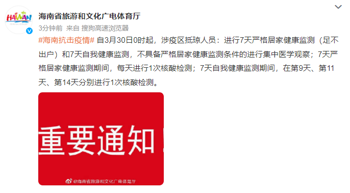 海南省表示,自3月30日0时起,涉疫区抵琼人员:进行7天严格居家健康监测(足不出户)和7天自我健康监测,不具备严格居家健康监测条件的进行集中医学观察;7天严格居家健康监测期间,每天进行1次核酸检测。