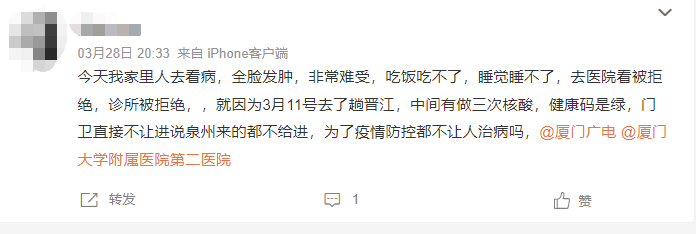 某网友表示,家人生病去医院遭拒诊,尽管健康码和核酸检测都是合格的,但仍遭医院拒绝。