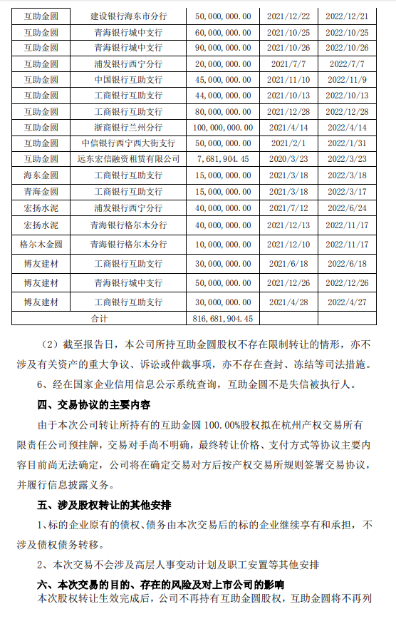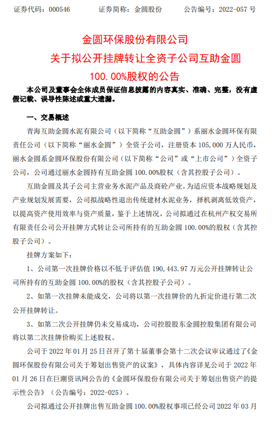 互助金圆及其子公司主营业务水泥产品及商砼产业。为适应资本战略规划及产业规划发展需要,公司拟战略性退出传统建材水泥业务,择机剥离低效资产,以提高资产使用效率与资产质量,鉴于上述情况,公司拟通过在杭州产权交易所有限责任公司公开挂牌方式转让公司所持有的互助金圆100%的股权(含其控股子公司)。