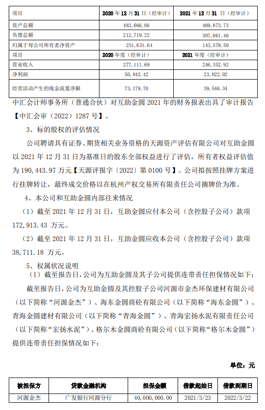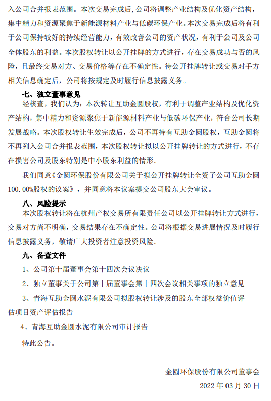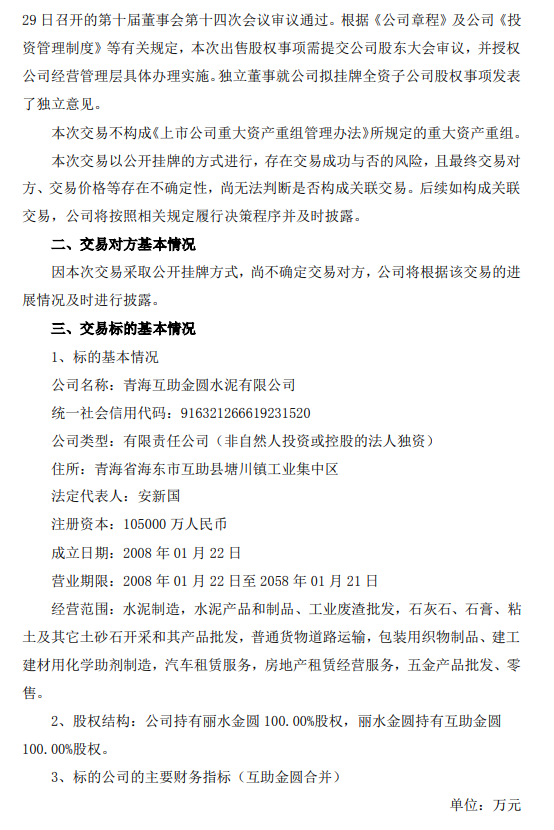 3月29日金圆股份公布,青海互助金圆水泥有限公司(“互助金圆”)系丽水金圆环保有限责任公司(“丽水金圆”)全资子公司,注册资本10.5亿人民币,丽水金圆系公司全资子公司,公司通过丽水金圆持有互助金圆100%股权(含其控股子公司)。