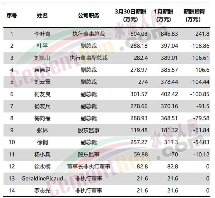 水泥人网注意到,最新公布的上市公司部分高管年薪较此前披露的数据有所下降。其中总裁李叶青薪酬直降241.8万元,从845.83万降至604.03万元 ;杜平、刘凤山、袁德足、刘云霞、柯友良等五位副总裁均有超过100万元的降薪;14位高管中有11位高管薪酬出现不同幅度的下调。