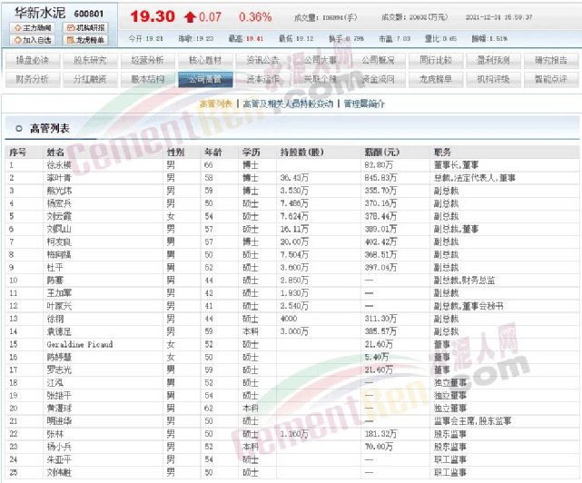 据水泥人网今年1月初消息,华新水泥2021年第六次临时股东大会。通过了《关于调整公司非执行董事长津贴的议案》。董事长徐永模的薪酬从216.2万元下调至82.8万元,直降133.2万元。